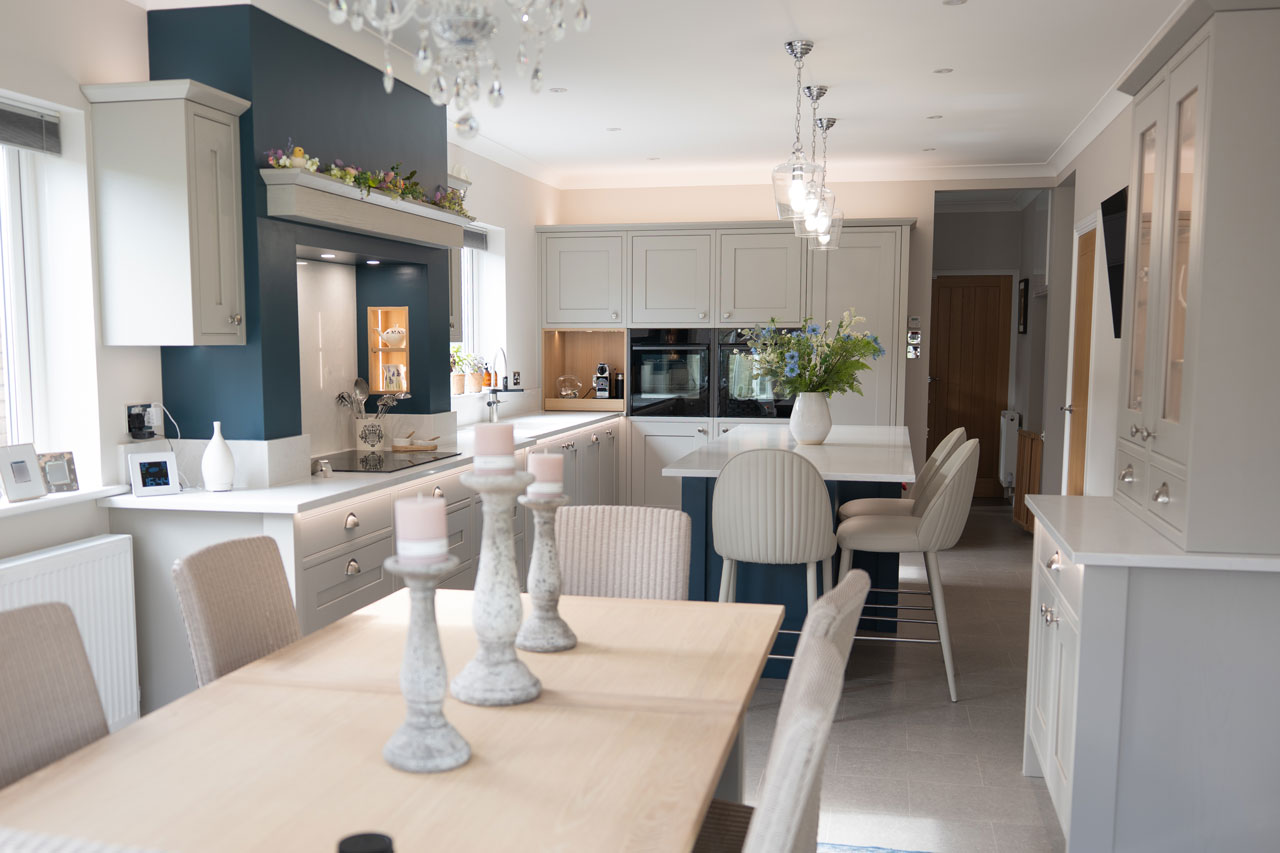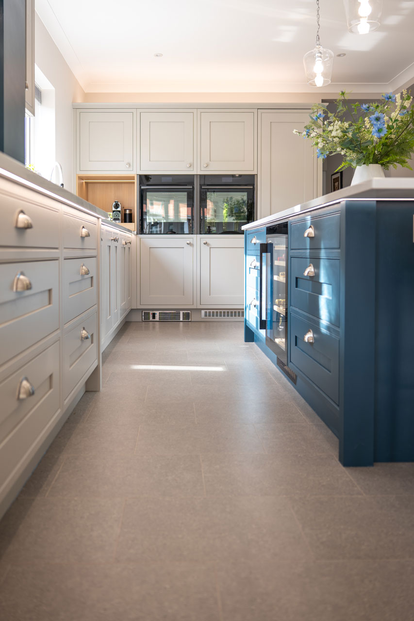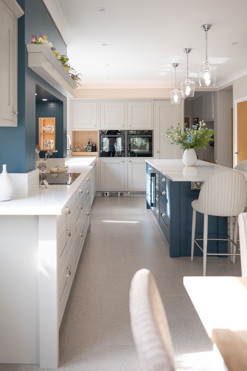 Cabinetry & Finishes: The kitchen features custom Inframe Marlow doors, providing a classic, premium feel. We used a sophisticated two-tone color scheme with Deep Ocean on the main cabinetry and Pebble on the island units, creating visual depth and a striking focal point.
