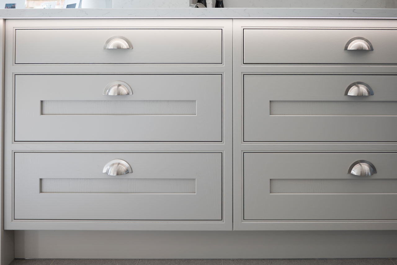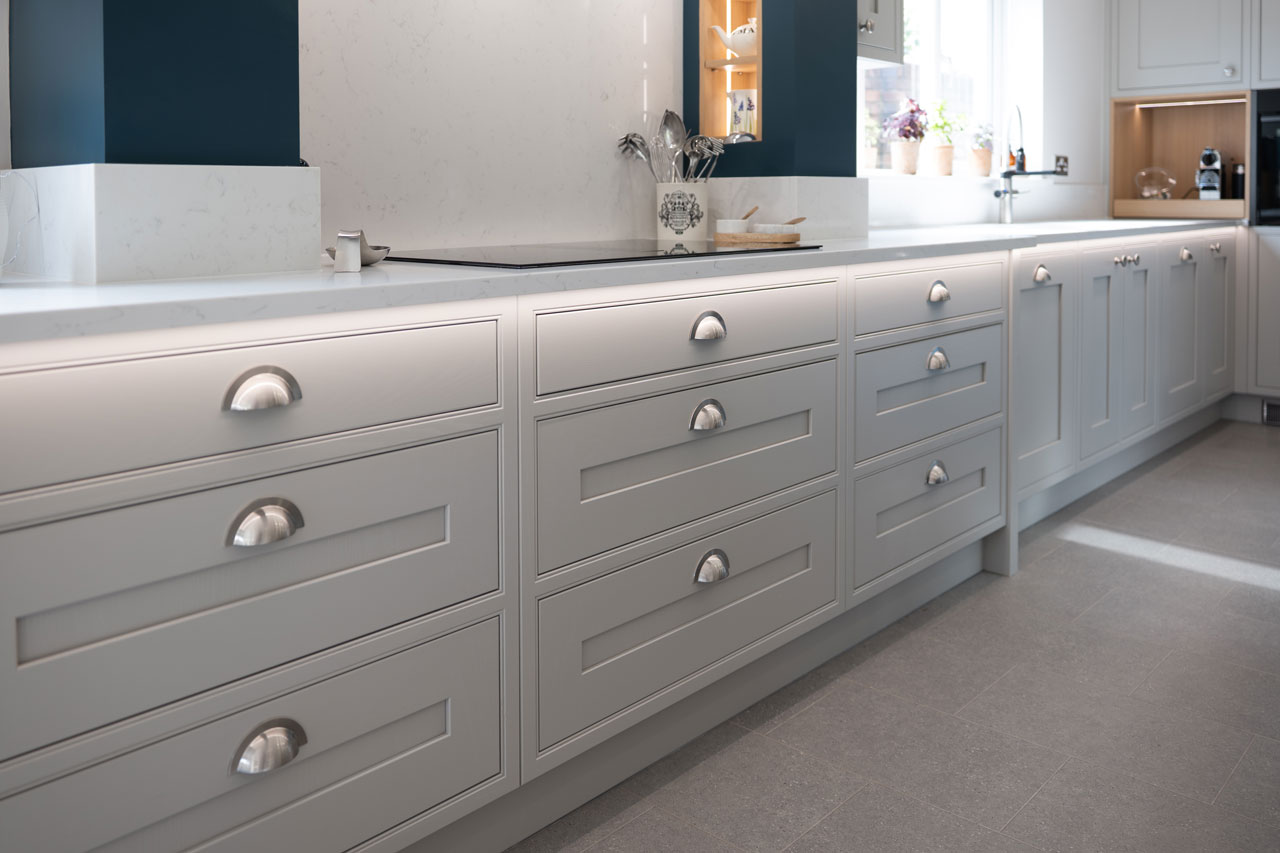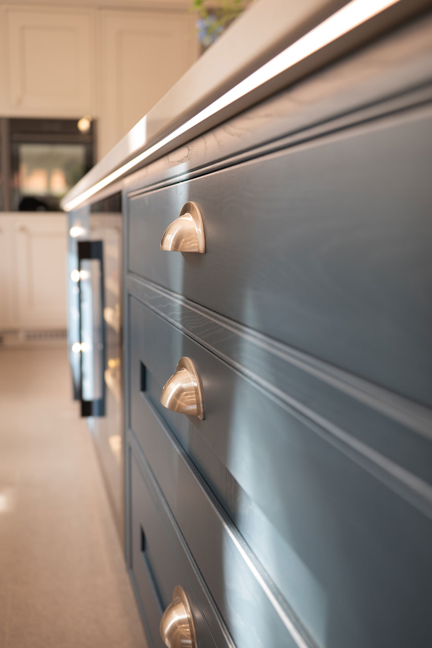 Cabinetry & Finishes: The kitchen features custom Inframe Marlow doors, providing a classic, premium feel. We used a sophisticated two-tone color scheme with Deep Ocean on the main cabinetry and Pebble on the island units, creating visual depth and a striking focal point.