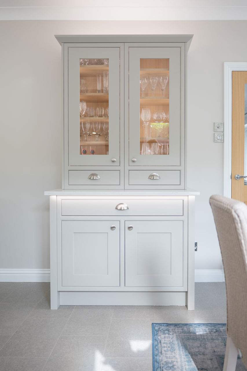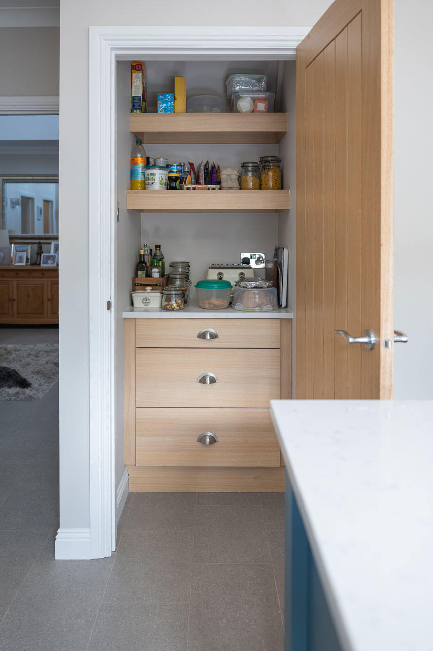 Integrated Features: A prominent Mantle over the hob creates a beautiful focal point, while a pantry and pullout storage in the corner maximize storage and efficiency. The design also includes a stunning display cabinet for showcasing glassware and dinnerware.