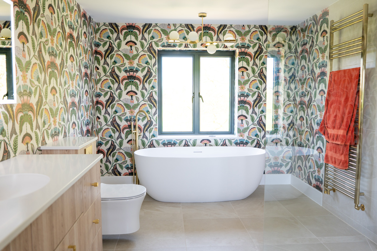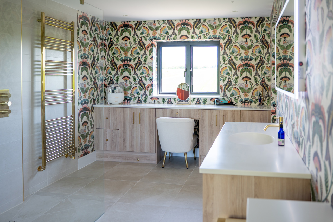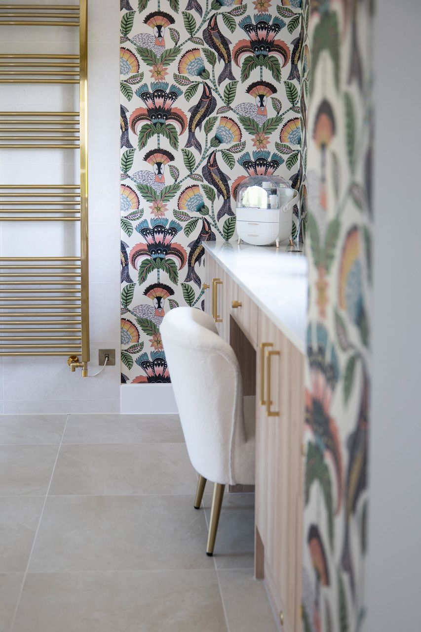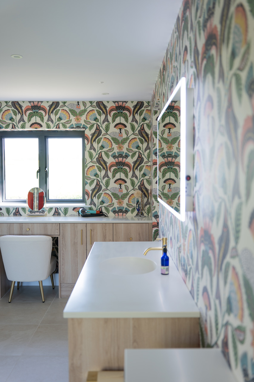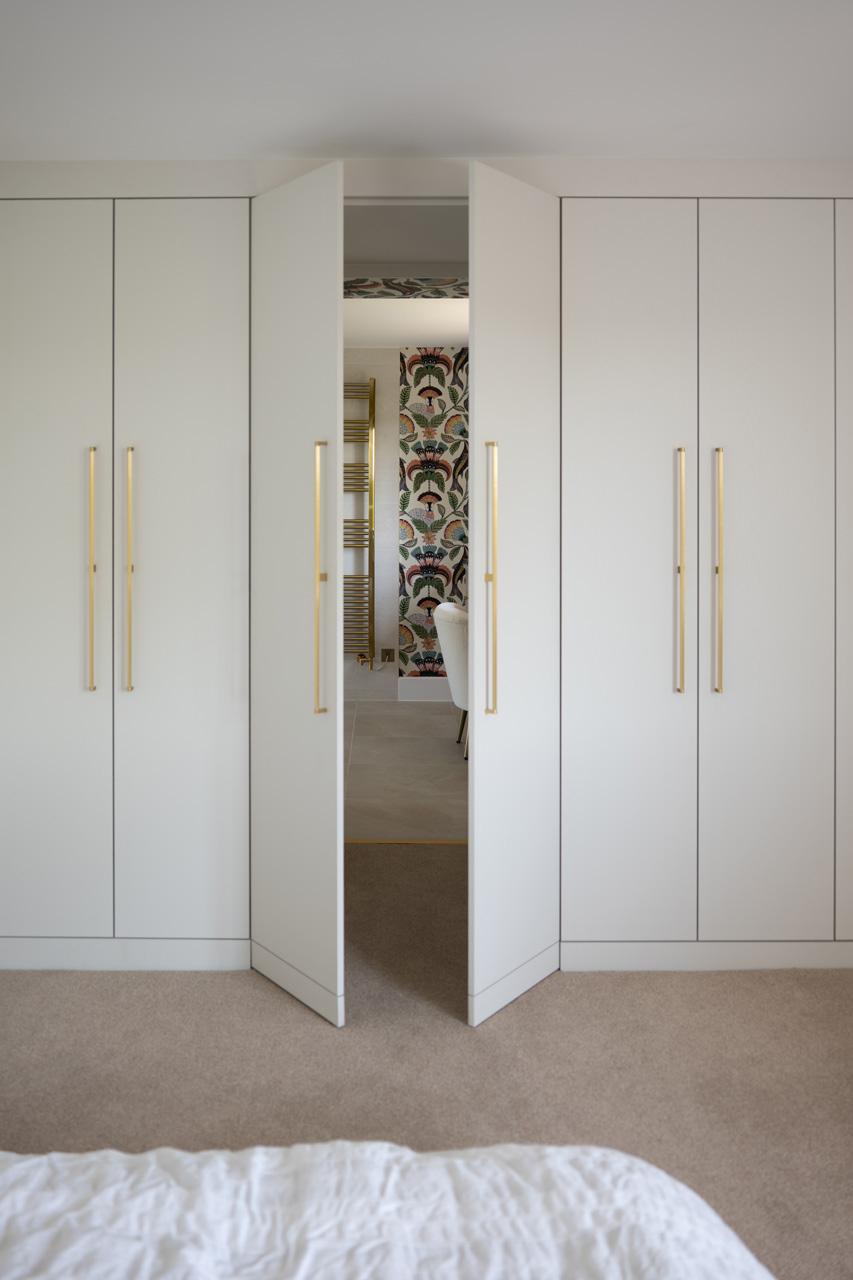 Hidden Ensuite: A hidden door conceals the entrance to the ensuite, revealing a bold and inviting space. The design includes designer wallpaper and striking brass fittings that enhance the vibrant color scheme.