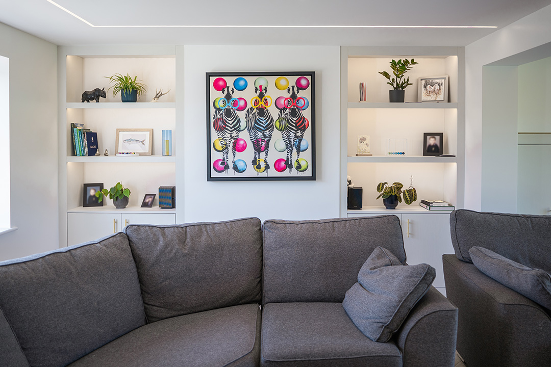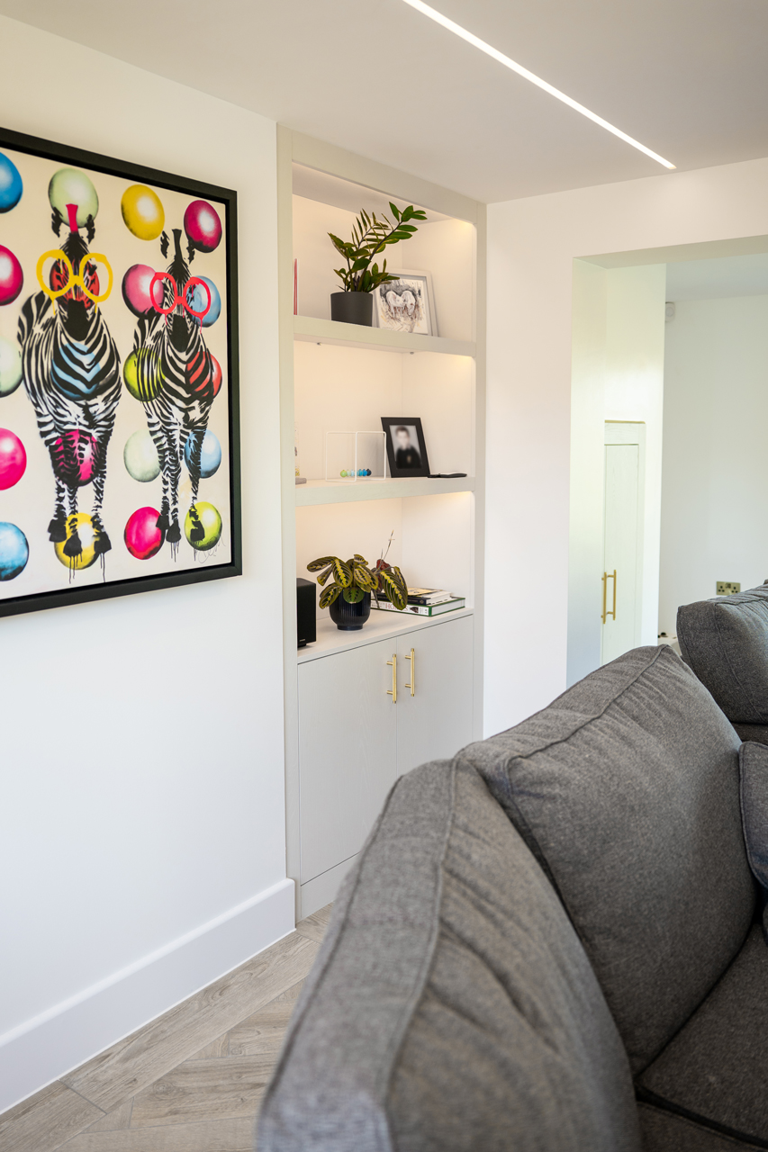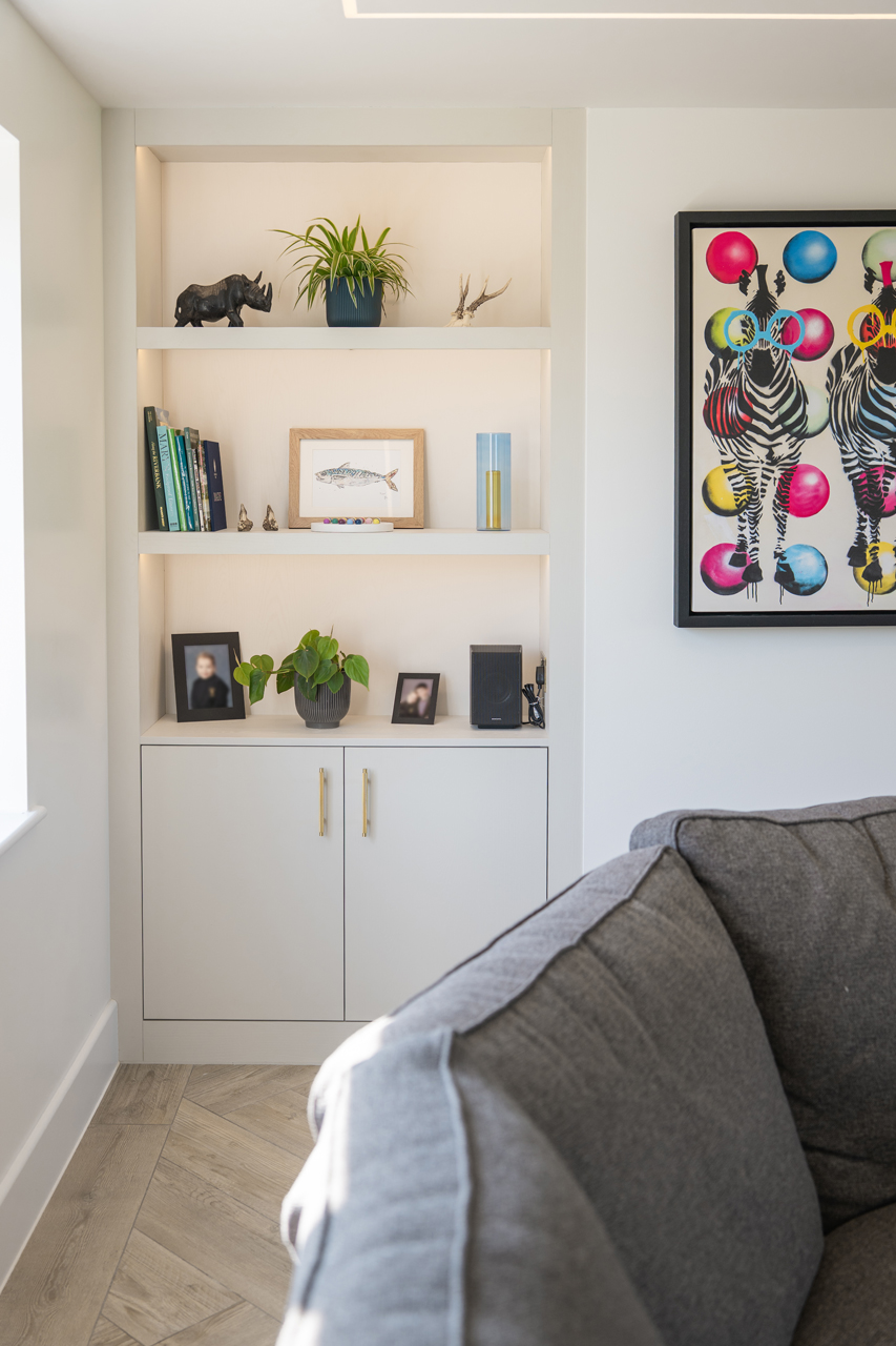 Built-in Storage: We installed low cupboards with open shelving in the alcoves, providing both display and storage space.