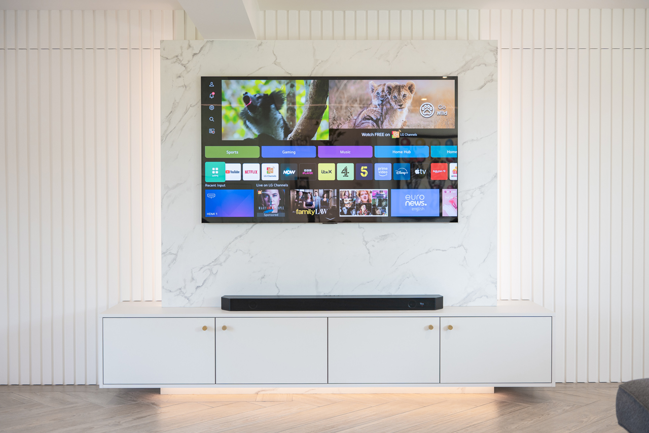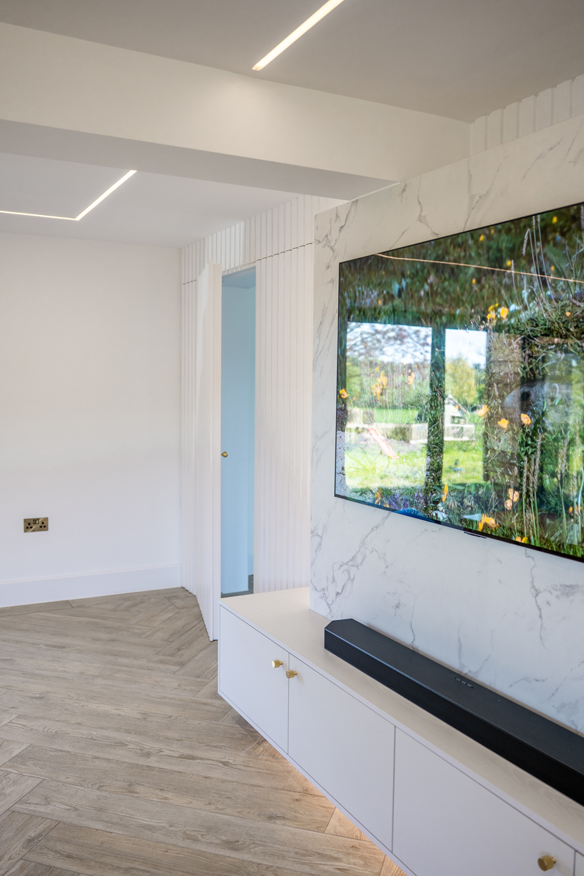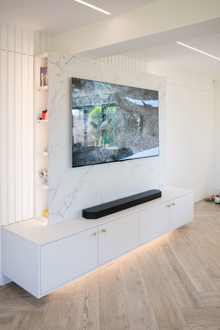 Media Wall: The media wall was designed to be clean and minimalist. It features hidden storage behind a stunning Crystal Marble backboard for the TV.